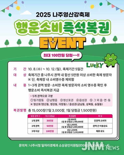 제이앤엠뉴스 | 전라남도 나주시가 ‘2025 나주영산강축제’를 찾는 시민과 관광객들에게 특별한 즐거움과 함께 지역 상권 활력을 불어넣기 위해 ‘행운 소비 즉석 복권 이벤트’를 진행한다.
