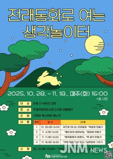 제이앤엠뉴스 | 고양특례시 주엽어린이도서관은 오는 10월 28일부터 11월 18일까지 북스타트 매니저와 함께하는 어린이 책놀이 프로그램 ‘전래동화로 여는 생각놀이터’를 운영한다고 밝혔다.
