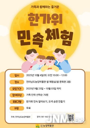 제이앤엠뉴스 | 전라남도 농업박물관은 다가오는 한가위를 맞아 가족 단위 관람객 대상으로 ‘한가위 민속 체험행사’를 10월 4일에 개최한다고 밝혔다.