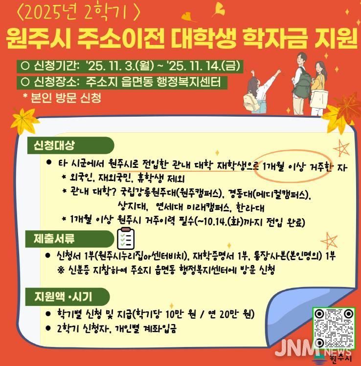 제이앤엠뉴스 | 원주시는 전입신고를 마치고 원주시민이 된 관내 대학생에게 상·하반기 각 10만 원씩 연 20만 원의 학자금을 지원하고 있다.