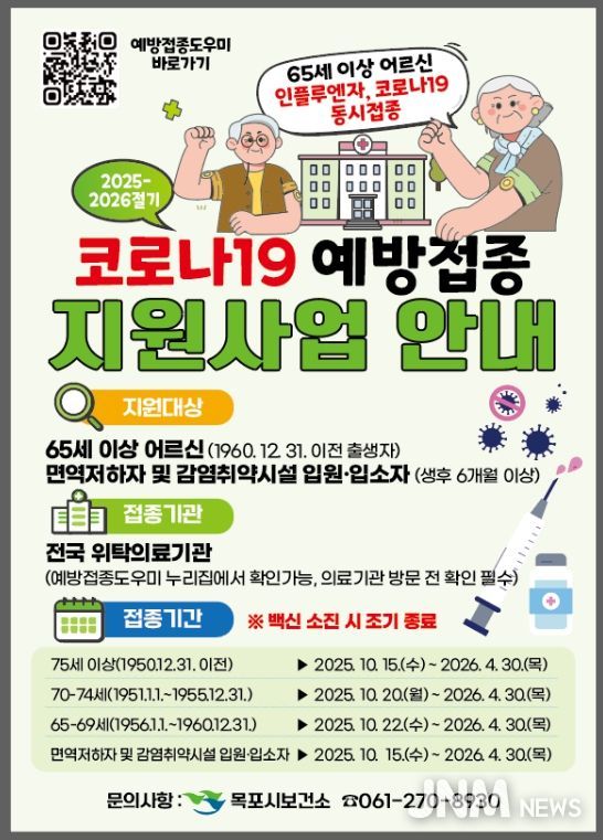 접종 대상은 ▲65세 이상 어르신 ▲생후 6개월 이상 면역저하자 ▲감염취약시설 입원·입소자이며, 목포시 위탁 의료기관 71개소에서 모더나와 화이자 등 LP.8.1 백신을 무료로 접종받을 수 있다.