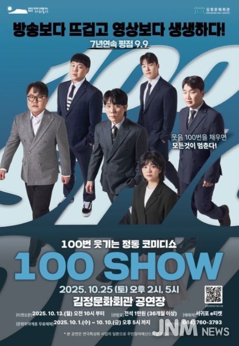 제이앤엠뉴스 | 서귀포시는 2025년 연극특성화사업의 마지막 공연으로, 전통적인 연극의 틀을 깨고 관객과 실시간으로 소통하는 신개념 코미디 연극 '100 SHOW'를 오는 10월 25일 오후 2시와 5시, 총 2회에 걸쳐 김정문화회관 공연장에서 선보인다.