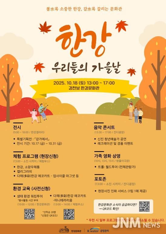 제이앤엠뉴스 | K-water한강보관리단과 케이워터운영관리 한강문화관은 오는 10월 18일 가족과 이웃이 함께 즐기는 대표 문화축제 “한강, 우리들의 가을날”를 개최한다고 밝혔다