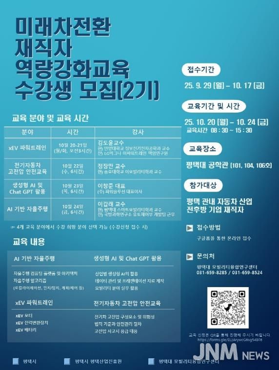 제이앤엠뉴스 | 평택시와 평택산업진흥원이 ‘미래차 전환 재직자 역량 강화교육’ 2기 과정을 개설한다. 교육은 10월 20일부터 24일까지 교육 운영기관인 평택대학교에서 진행되며, 지역 자동차 산업 재직자를 대상으로 미래차 핵심 분야 전문지식을 제공한다.