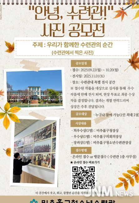 제이앤엠뉴스 | 인천 미추홀구청소년수련관은 수련관 이전을 앞두고 지난 30여 년간의 추억을 함께 기록하기 위해 ‘안녕, 수련관’ 사진 공모전을 진행하고 있다고 2일 밝혔다.