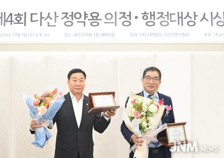 제이앤엠뉴스 | 파주시의회 박대성 의장, 손형배 의원은 10월 1일 파주시의회에서 열린 제4회 다산 정약용 의정·행정대상에 기초의원 부문 대상을 수상했다. 또한 파주를 지역구로 둔 경기도의회 이한국 도의원도 광역의원 부문에 함께 수상되어 의미를 더했다.