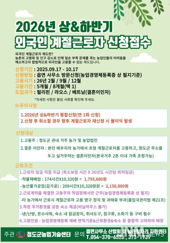 제이앤엠뉴스 | 청도군은 농촌 인구감소와 고령화로 인한 농번기 일손 부족 문제 해소를 위해 9월 17일부터 10월 17일까지 '2026년 상·하반기 외국인 계절근로자' 고용 희망농가 수요조사를 실시하고 있다.