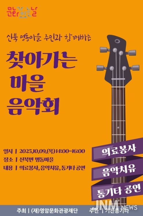 제이앤엠뉴스 | (재)영암문화관광재단은 2025 문화가 있는 날 행사지원 사업으로 생활문화 동호회인 기찬통기타(대표:최문일)와 함께 신북 명동마을 주민을 대상으로 한 ‘찾아가는 마을 음악회’를 오는 10월 9일 한글날에 개최한다고 밝혔다.