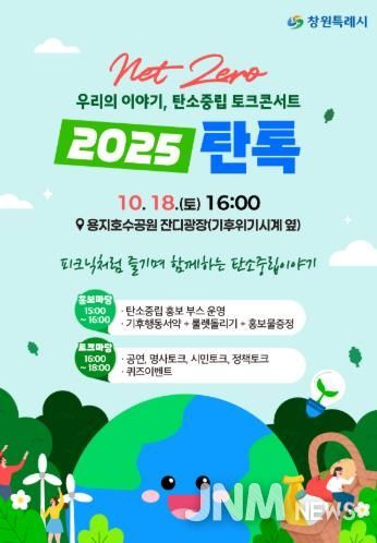 제이앤엠뉴스 | 창원특례시는 오는 10월 18일 오후 4시 용지호수공원 탄소제로하우스 앞 잔디광장에서 기후위기 대응과 탄소중립 실천 문화를 확산하기 위해 탄소중립 토크콘서트 ‘2025탄톡’을 개최한다.