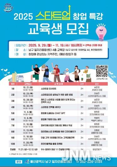 제이앤엠뉴스 | 울산 남구 일자리종합센터는 창업 역량 강화와 성공적인 창업 준비 기반을 마련하는 데 실질적인 도움을 주고자 ‘2025년 스타트업 창업 특강’교육생을 모집한다고 밝혔다.