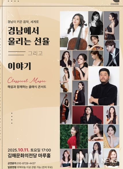 제이앤엠뉴스 | 김해시는 2025 경남 문화예술주간 첫날인 오는 11일 김해문화의전당 마루홀에서 경남이 키운 음악, 세계로 ‘경남에서 울리는 젊은 선율, 그리고 이야기’ 공연을 개최한다. 이번 공연은 경남도와 김해시의 후원을 받아 지역의 대표 클래식 전문단체인 크레센도 주관으로 마련된다.