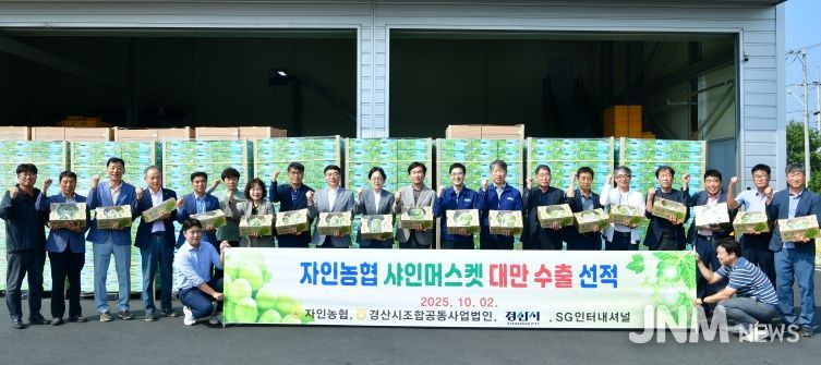 제이앤엠뉴스 | 경산시는 2일 자인농협 농산물유통센터에서 조현일 경산시장, 조지연 국회의원, 손병한 자인농협장, 포도 공선회원을 비롯한 관계자 30여 명이 참석한 가운데 대만 수출 선적식을 개최했다.