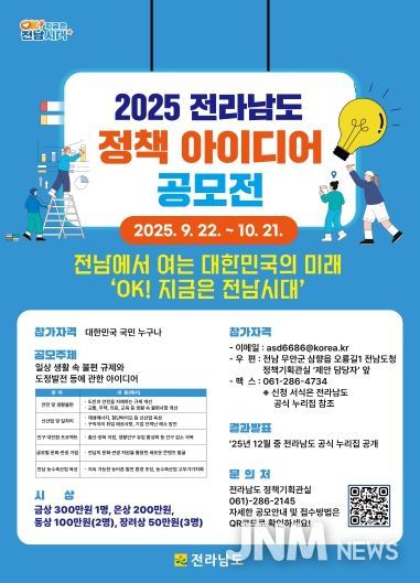 제이앤엠뉴스 | 전라남도가 새 정부의 실용주의 기조에 맞춰 ‘생활 속 불편을 찾고 이를 개선할, 지역의 미래를 먹여 살릴 정책’을 주제로 ‘2025년 전라남도 정책 아이디어 공모전’을 개최한다.