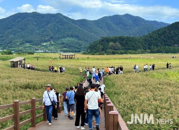 제이앤엠뉴스 | 추석 연휴 순천만습지를 찾은 방문객들이 가을 정취 속에서 갈대밭 산책을 즐기고 있다.