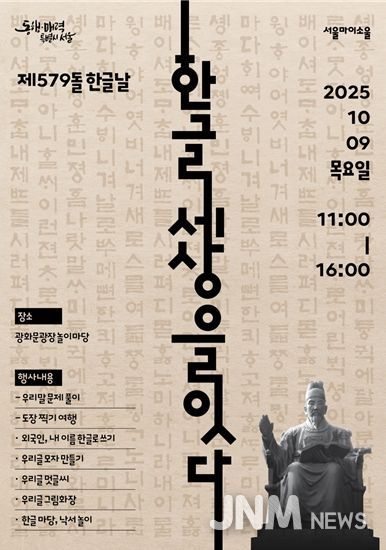 제이앤엠뉴스 | 서울시는 제579돌 한글날을 맞아 10월 9일 오전 11시부터 오후 4시까지 광화문광장 세종대왕상 앞에서 한글날 기념 시민참여 행사를 진행한다.
