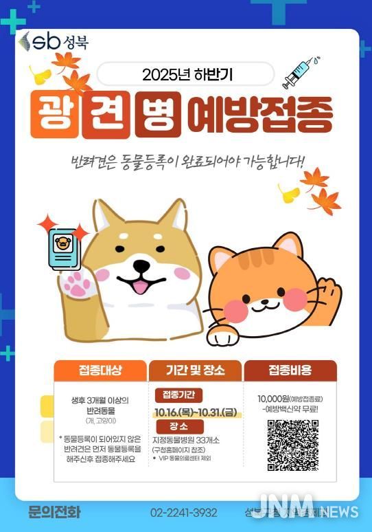 제이앤엠뉴스 | 서울 성북구가 10월 16일부터 31일까지 16일간 가을철 광견병 예방접종을 실시한다.