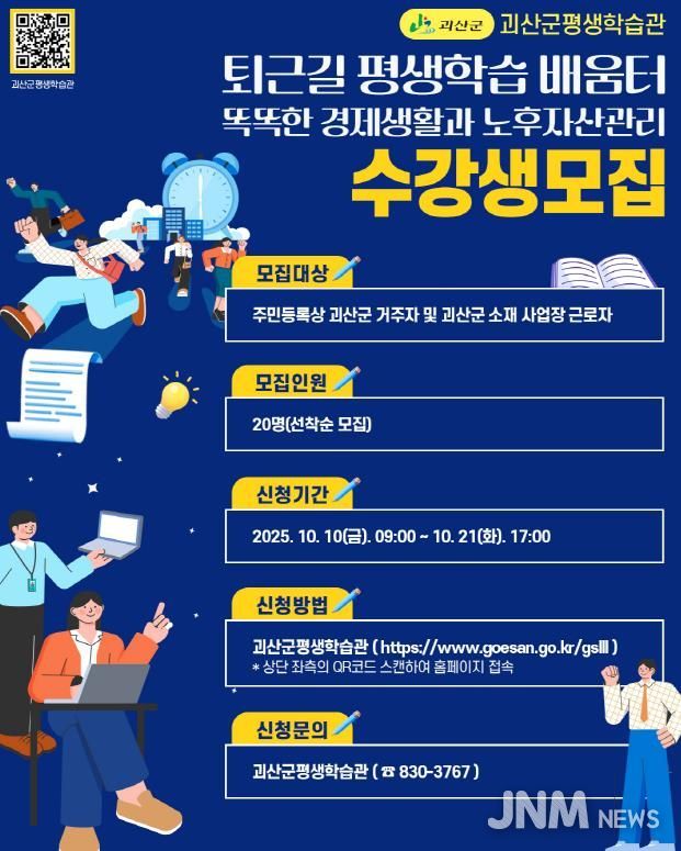 제이앤엠뉴스 | 충북 괴산군은 10일부터 오는 21일까지 ‘2025년 괴산군 평생학습관 퇴근길 평생학습 배움터’ 수강생을 모집한다고 밝혔다.
