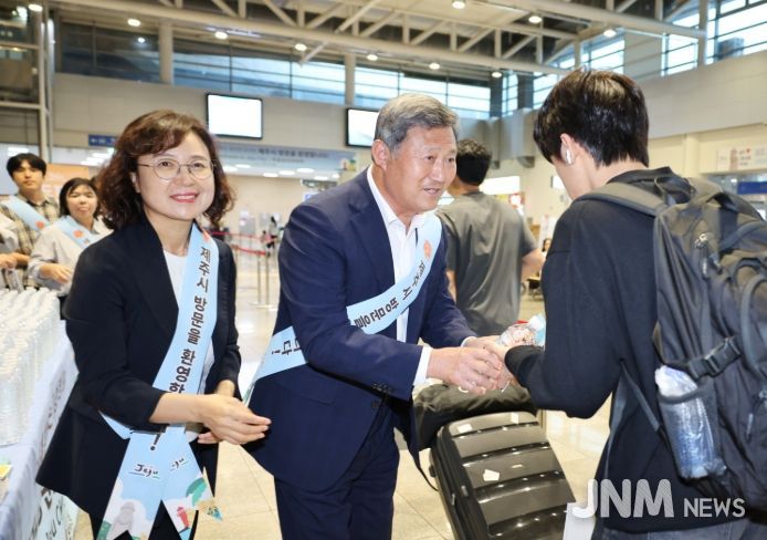 제이앤엠뉴스 | 김완근 제주시장은 2일 제주항국제여객터미널에서 추석 황금연휴를 맞아 제주를 찾은 귀성객과 관광객을 환영했다.