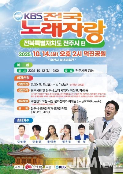 전주시는 오는 14일 오후 2시, 덕진공원 특설무대에서 시민과 함께하는 전국민적 노래 경연 프로그램인 ‘KBS 전국노래자랑 전주시편’이 진행된다고 10일 밝혔다.