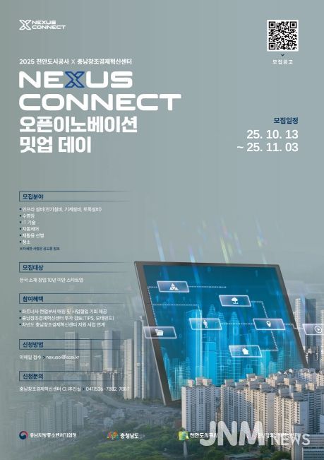 제이앤엠뉴스 | (재)충남창조경제혁신센터와 천안도시공사(지방공기업)은 스마트 시티 (공공 인프라·시설운영)분야 스타트업을 발굴·육성하기 위해 ‘2025 천안도시공사 x 충남창조경제혁신센터 Nexus Conncect 오픈이노베이션 밋업 데이’참여 기업을 11월 3일까지 모집한다고 밝혔다.