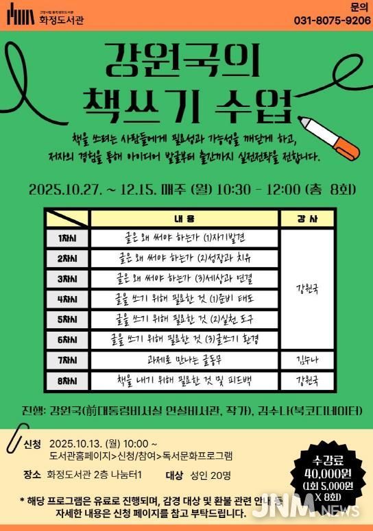 제이앤엠뉴스 | 고양특례시는 10월 27일부터 12월 15일까지 매주 월요일 오전 10시 30분부터 12시까지, 화정도서관 2층 나눔터1에서 ‘강원국의 책쓰기 수업’프로그램을 운영한다고 밝혔다.