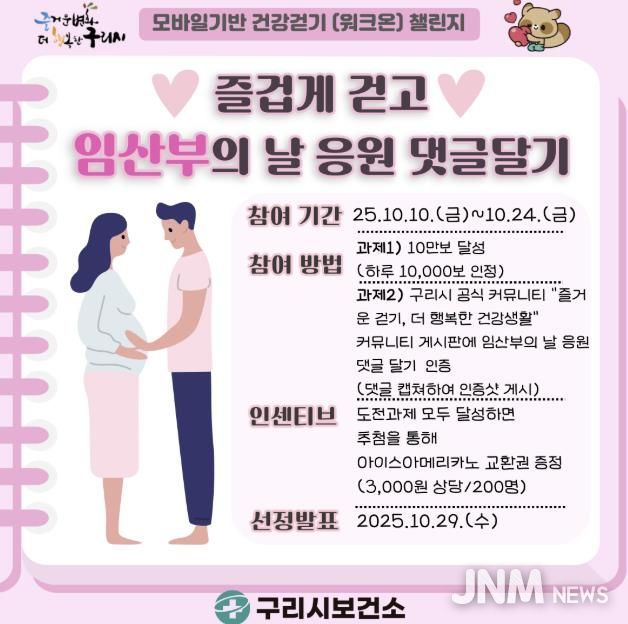 제이앤엠뉴스 | 구리시는 제20회‘임산부의 날’(10월 10일)을 기념해 임신과 출산의 가치를 되새기고 시민 건강 증진을 도모하기 위한 ‘즐겁게 걷고, 임산부의 날 응원 댓글 달기’ 챌린지를 오는 10월 10일부터 24일까지 15일간 운영한다고 밝혔다.