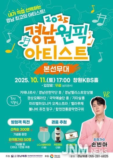 제이앤엠뉴스 | 경상남도는 도내 우수 공연예술인과 단체를 발굴하고 지속적인 활동 기회를 제공하기 위한 오디션형 공연 프로그램 ‘경남 원픽 아티스트’의 결선 무대를 10월 11일 오후 5시, 창원KBS홀에서 개최한다.