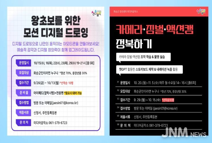 제이앤엠뉴스 | 화순군(군수 구복규)은 오는 10월 15일과 20일 화순군 청년센터(청춘들락) 미디어공작소에서 영상 제작과 디지털드로잉 분야의 창의적 미디어 교육 프로그램을 시작한다고 밝혔다.