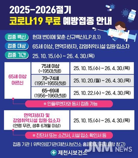 제이앤엠뉴스 | 제천시는 오는 15일부터 65세 이상 어르신, 생후 6개월 이상 면역저하자, 감염취약시설 입원․입소자를 대상으로 신규 코로나 백신(LP.8.1)을 활용해 코로나19 무료 예방접종을 실시한다.