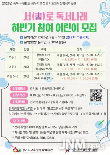 제이앤엠뉴스 | 경기도교육청평생학습관이 수원교육지원청과 함께 어린이 독서 습관 형성과 사고력 향상을 위하여 초등학교 3~6학년을 대상으로‘서(書)로 독서나래’를 운영한다.
