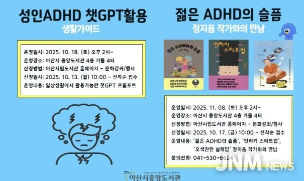 제이앤엠뉴스 | 아산시립도서관은 성인 ADHD(주의력결핍 과잉행동장애)에 대한 사회적 인식 개선과 실질적인 생활 지원을 위해 오는 10월과 11월 중앙도서관에서 주제 특강을 운영한다고 밝혔다.