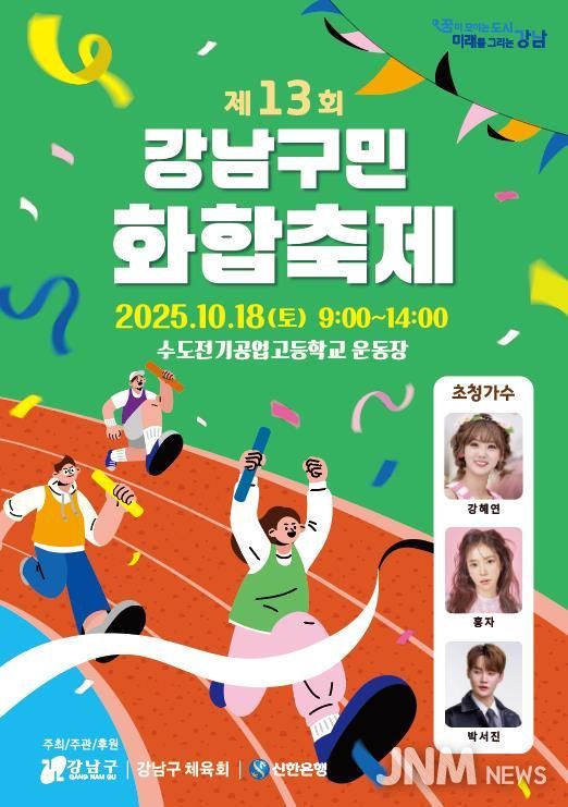 제이앤엠뉴스 | 꿈이 모이는 도시, 미래를 그리는 강남구가 오는 10월 18일 오전 9시부터 오후 2시까지 수도전기공업고등학교 운동장에서 ‘제13회 강남구민화합축제’를 개최한다. 구민과 선수단 등 약 7,500명이 참여할 예정이며, 소통과 화합을 바탕으로 건강한 지역사회를 만드는 의미 있는 자리가 될 것으로 기대된다.
