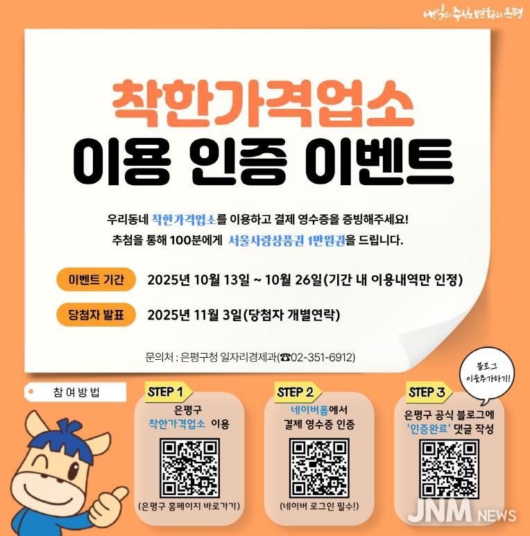 제이앤엠뉴스 | 서울 은평구는 지역 경제 활성화와 물가 안정 분위기 조성을 위해 13일부터 오는 26일까지 2주간 ‘착한가격업소 이용 인증 이벤트’를 진행한다고 밝혔다.