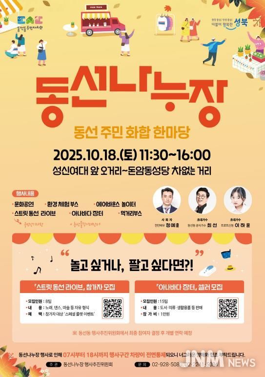 제이앤엠뉴스 | 서울 성북구가 오는 10월 18일 오전 11시 30분부터 오후 4시까지 성신여대 앞 오거리에서 돈암동성당 구간까지 이어지는 도로에서 ‘2025년 차 없는 거리 동선나누장’을 개최한다.