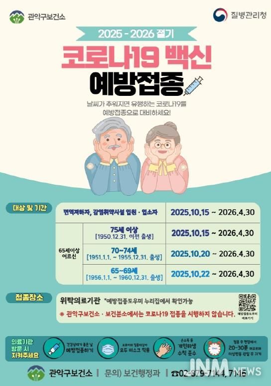 제이앤엠뉴스 | 관악구가 호흡기 질환이 증가하는 동절기 대비, 코로나19 감염 고위험군을 대상으로 코로나19 백신 무료 접종을 실시한다.