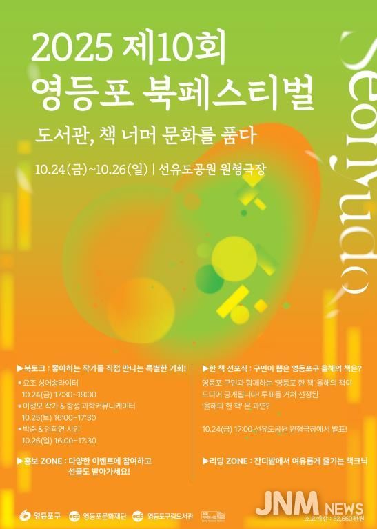 한편 오는 10월 24일부터 26일까지 선유도공원에서 ‘제10회 영등포 북페스티벌’이 열린다. 이번 축제는 영등포 대표 지역축제인 ‘선유도원 축제’와 연계해 진행되며, 선선한 가을 바람 속에서 특별한 독서의 즐거움을 느낄 수 있다. 자세한 사항은 구청 미래교육과 또는 영등포구립도서관으로 문의하면 된다.
