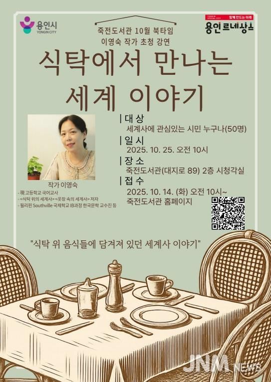 제이앤엠뉴스 | 용인특례시는 25일 오전 10시 죽전도서관 시청각실에서 죽전도서관 북타임 작가초청강연회 ‘식탁에서 만나는 세계 이야기’를 연다고 13일 밝혔다.