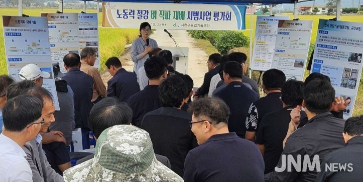 제이앤엠뉴스 | 서천군농업기술센터는 지난 2일 서천군 화양면 고마리 일원에서 벼농사 생력화와 저탄소 농업실천 확대를 위한 ‘벼 직파재배 현장 평가회’를 개최했다.