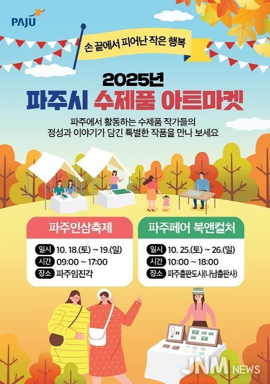 제이앤엠뉴스 | 파주시는 오는 18일부터 19일까지 이틀간 열리는 ‘파주인삼축제’와 오는 25일부터 26일까지 개최되는 ‘파주페어_북앤컬처’ 행사장에서 지역 수공예 작가들이 참여하는 ‘수제품 아트마켓’을 운영한다.