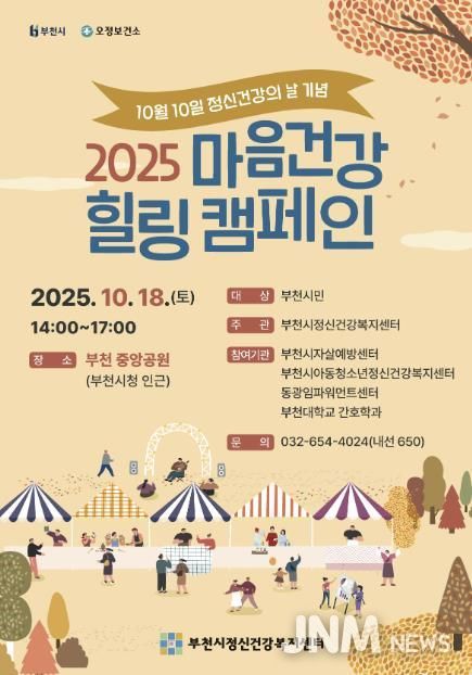 제이앤엠뉴스 | 부천시는 부천시정신건강복지센터와 함께 2025년 정신건강의 날(10월 10일)을 기념해 10월 18일 오후 2시부터 부천중앙공원에서 ‘2025 마음건강 힐링캠페인’을 연다.