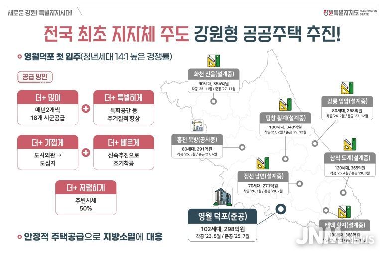 제이앤엠뉴스 | 강원특별자치도는 청년과 신혼부부 등 지역 정착 인구 확대를 위한 안정적인 주택공급을 목표로 전국 최초의 지자체 주도형 주거모델인 강원형 공공주택 사업을 적극 추진하고 있다고 밝혔다.