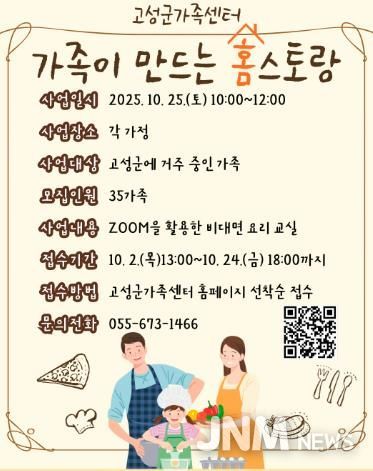 제이앤엠뉴스 | 고성군가족센터는 오는 10월 24일까지 집에서 즐기는 비대면 요리프로그램'가족이 만드는 홈스토랑'참여 가족을 모집한다고 밝혔다.