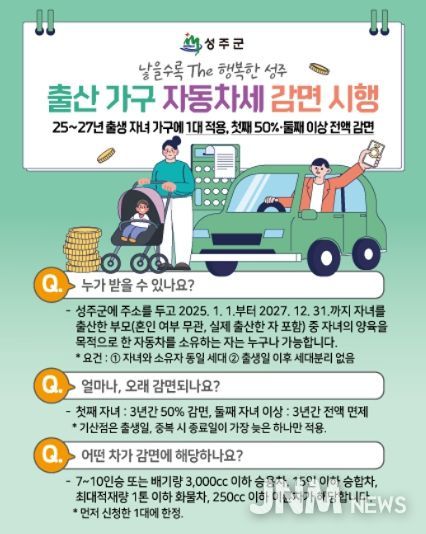 제이앤엠뉴스 | 성주군은 13일 올해를 포함해 2027년까지 자녀를 출산한 가구를 대상으로 자동차세를 50%(둘째 자녀 이상 전액) 감면한다고 밝혔다.