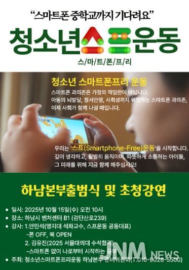제이앤엠뉴스 | 15일 오전 10시, 하남시 벤처센터에서 ‘청소년 스마트폰 프리 운동(Smartphone-Free)’ 하남본부 출범식을 갖는다.