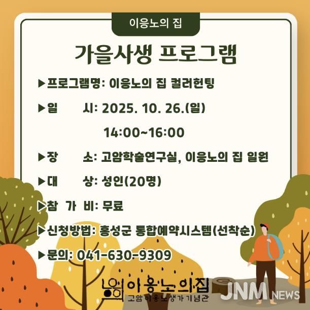 제이앤엠뉴스 | 홍성군 고암이응노생가기념관은 오는 26일 오후 2시부터 4시까지, ‘가을사생 프로그램’을 운영한다고 밝혔다.