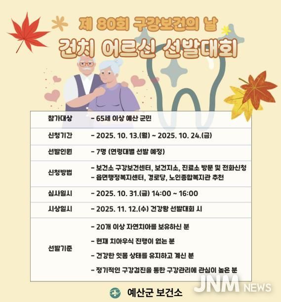 제이앤엠뉴스 | 예산군보건소는 ‘제80회 구강보건의 날’을 맞아 건강하고 활기찬 구강생활 실천 분위기 조성을 위해 건치(건강한 치아)어르신 선발대회를 개최한다.