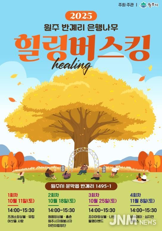 2025 힐링 버스킹은 앞으로 3회(10월 18일·25일, 11월 8일) 공연을 남겨두고 있으며, 문막읍 반계리 은행나무 광장에서 오후 2시부터 3시 30분까지 진행된다.