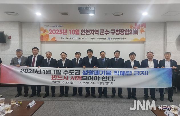 인천시는 10월 13일 남동구에서 열린 인천지역 군수・구청장 협의회에서 군・구 단체장과 함께 2026년 1월 1일부터 수도권 생활폐기물 직매립 금지는 법과 원칙에 따라 반드시 시행되어야 한다는 결의를 재차 다지며, 시민 불편 없이 생활폐기물 직매립 금지에 철저히 대비할 수 있도록 공동 대응방안을 모색했다.