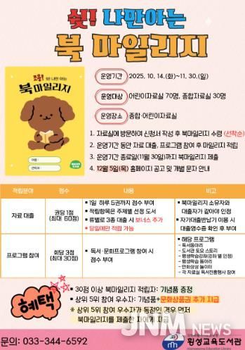 제이앤엠뉴스 | 횡성교육도서관은 10월 14일부터 11월 30일까지 지역주민의 독서 활동을 장려하고 도서관 이용을 활성화를 위해 ‘쉿, 나만 아는 북 마일리지’ 프로그램을 운영한다고 밝혔다.