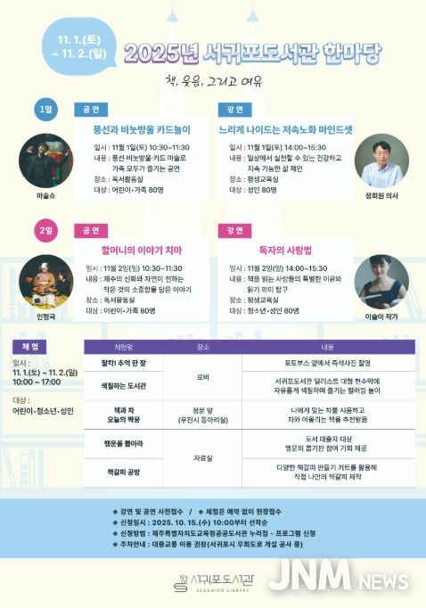 제이앤엠뉴스 | 제주도교육청 서귀포도서관은 11월 1일과 2일 양일간 지역 주민이 함께 즐기는 독서문화 축제 ‘2025년 서귀포도서관 한마당’을 개최한다.